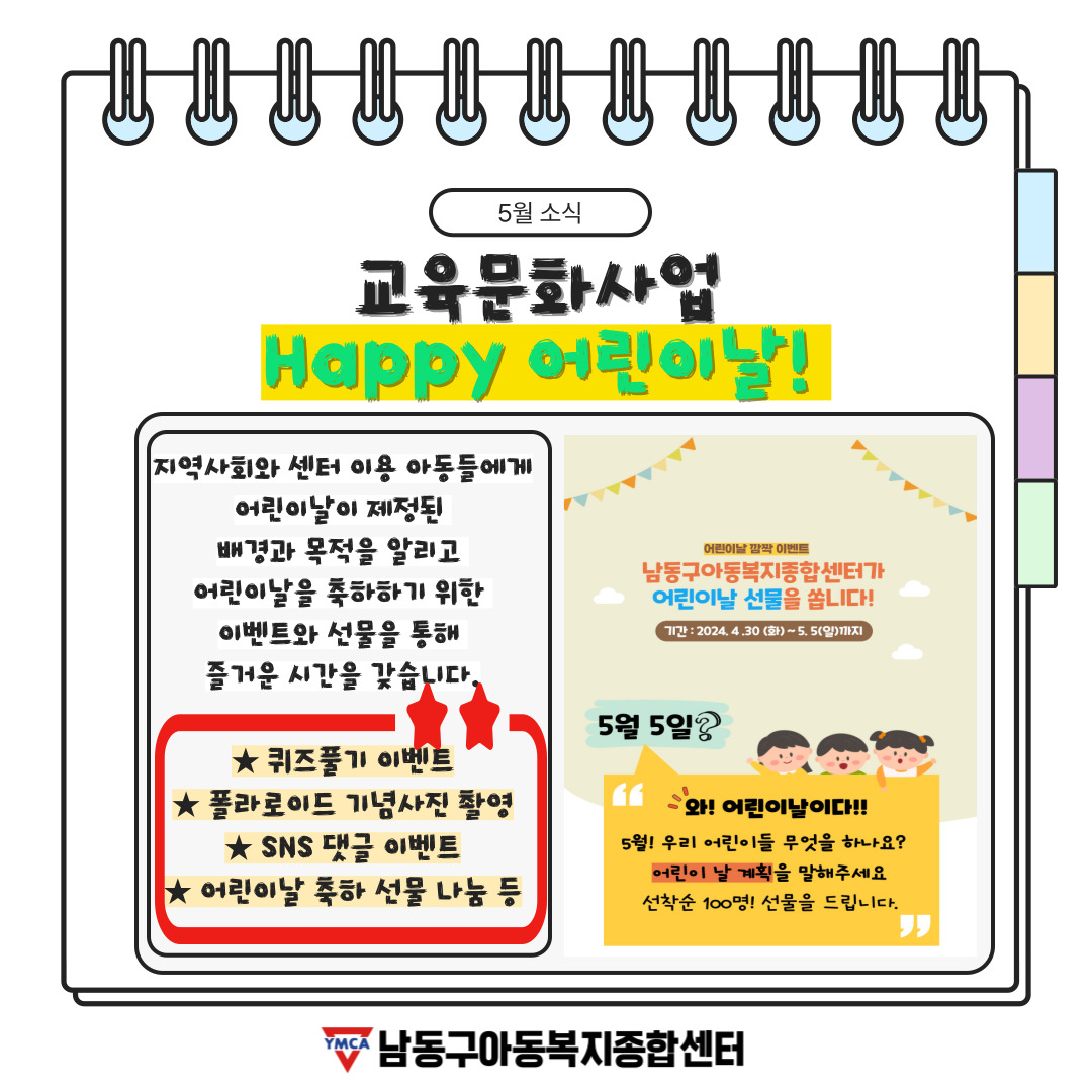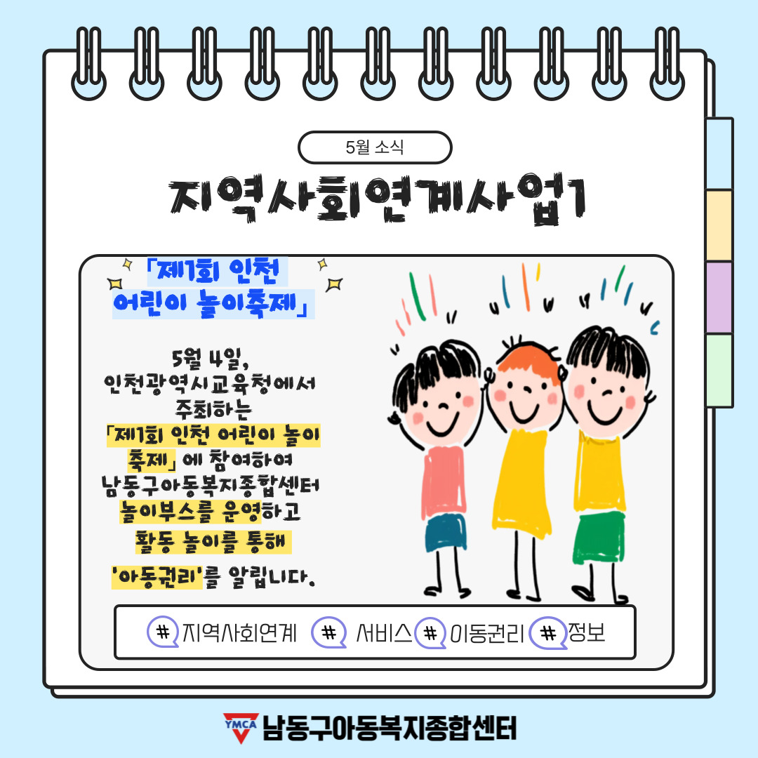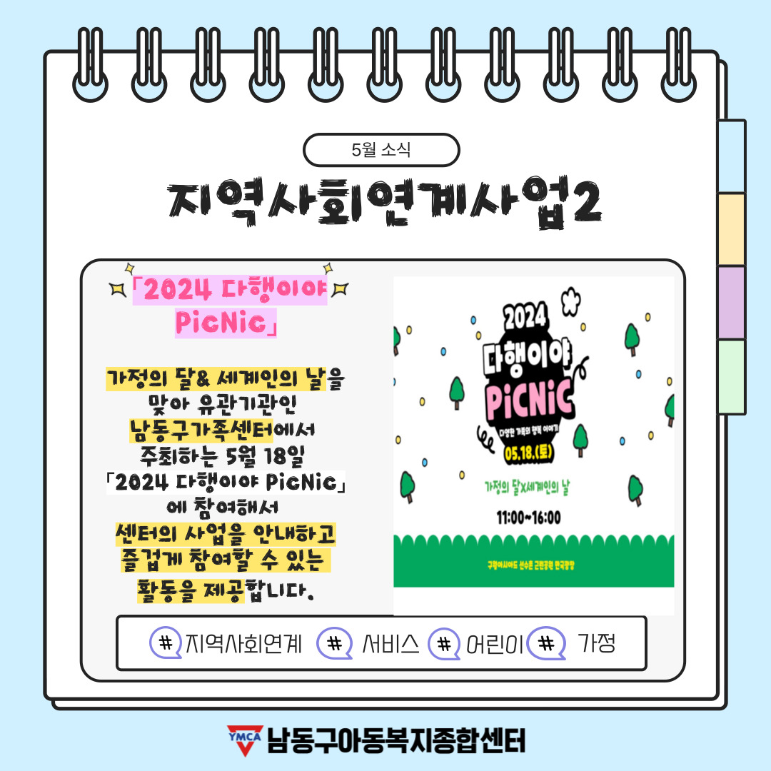 남동구아동복지종합센터(센터장 박혜선)에서 2024년 5월에 진행되는 소식이 카드뉴스로 안내되었다. 5월에는 센터 내 어린이날 행사와 5월 4일과 5월 18일에 지역사회연계사업으로 가정의달 행사에 참여한다. 참여자 모집으로는 양육자 독서모임 참여자와 아동인권 교육 신청기관을 모집하며 센터의 시설 개방 및 시설 대관을 한다.