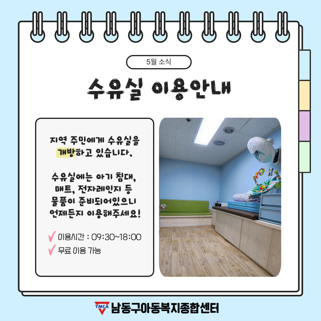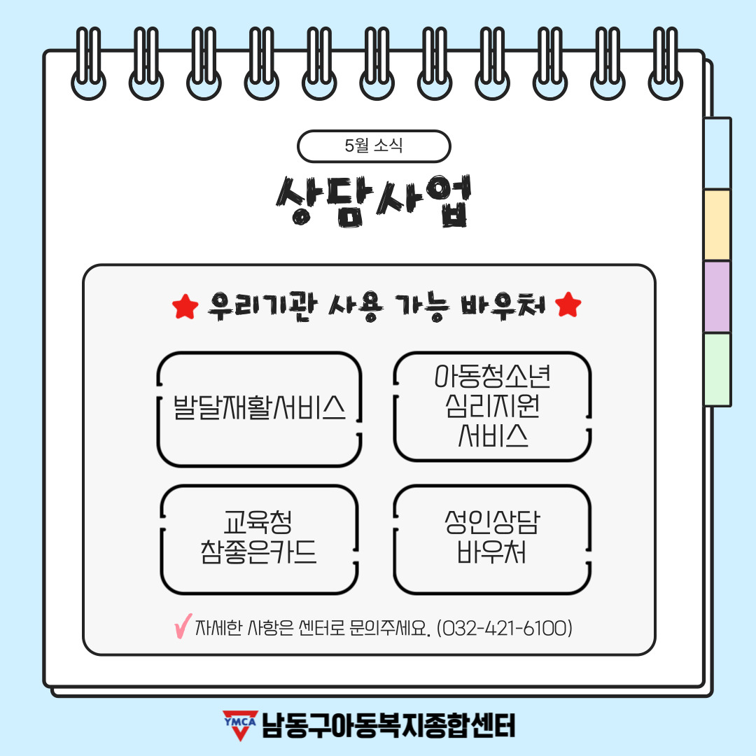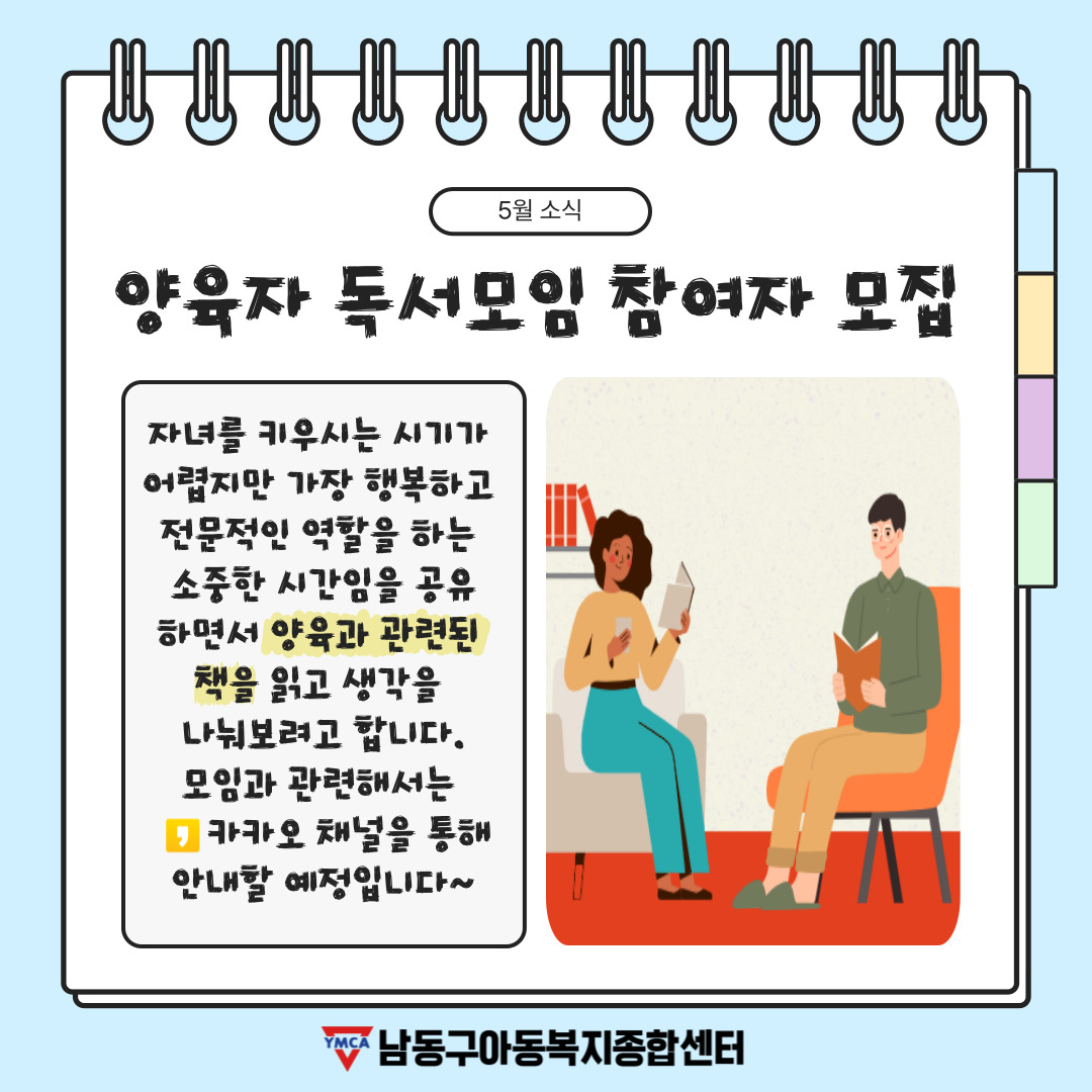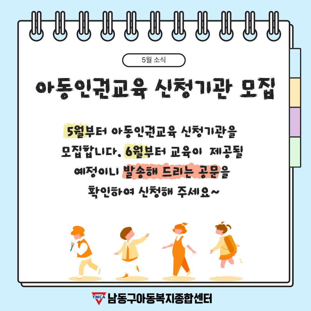 남동구아동복지종합센터(센터장 박혜선)에서 2024년 5월에 진행되는 소식이 카드뉴스로 안내되었다. 5월에는 센터 내 어린이날 행사와 5월 4일과 5월 18일에 지역사회연계사업으로 가정의달 행사에 참여한다. 참여자 모집으로는 양육자 독서모임 참여자와 아동인권 교육 신청기관을 모집하며 센터의 시설 개방 및 시설 대관을 한다.