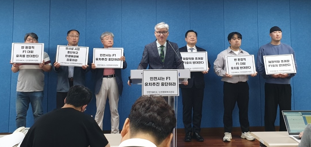 인천YMCA(회장 조성일)와 인천평화복지연대(상임대표 강주수)는 5월 13일(월) 오후2시, 인천시청 기자회견실에서 인천시의 F1 유치에 반대하는 기자회견을 진행했다. 이광호 인천평화복지연대 사무처장의 사회로 진행된 이번 기자회견에서는 강주수 인천평화복지연대 상임대표와 차성수 인천YMCA 사무처장이 취지 발언을 하였고, 조성일 인천YMCA 회장이 기자회견문을 낭독하였다. 인천YMCA와 인천평화복지연대는 F1 대회가 재정적으로 실패할 가능성이 높으며, 인천시 재정을 악화시킬 것이고, 반환경적인 대회이며, 인천시의 도시 이미지에도 도움이 되지 않는다는 이유로 반대 입장을 표명했으며 이후에도 중단하지 않을 경우 인천지역 시민사회와 함께 지속적으로 반대 운동을 전개할 것을 밝혔다. 기자회견문 전문은 아래와 같다.