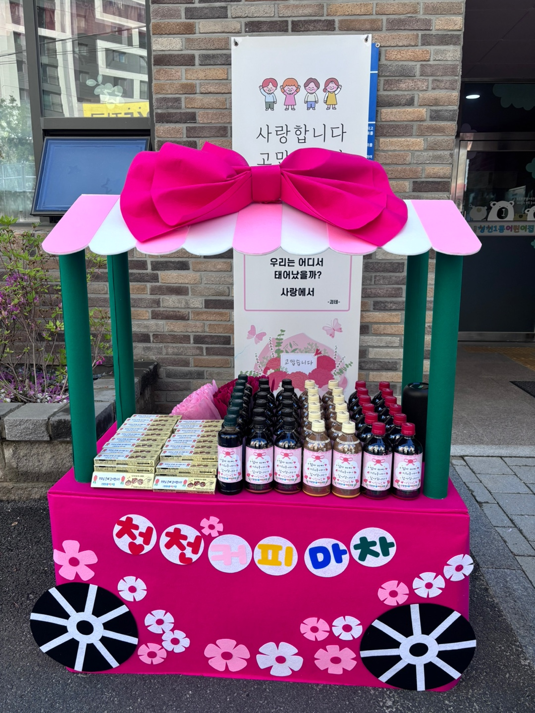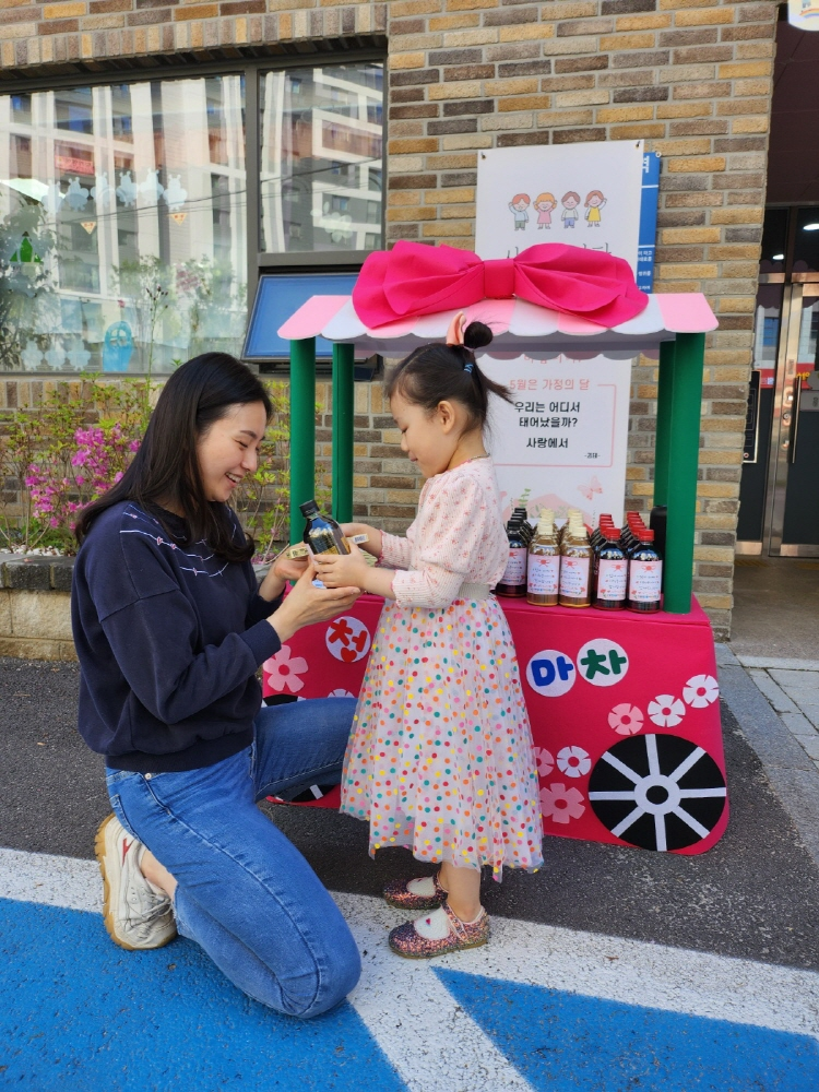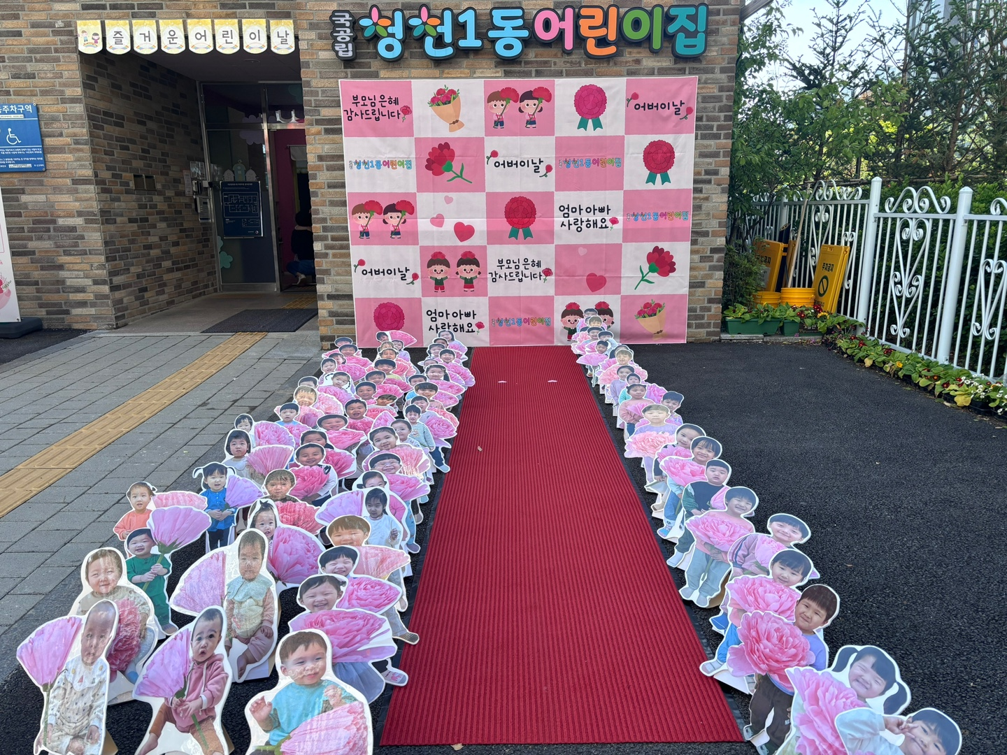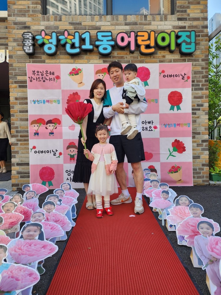 사랑을 전해孝!! 어버이날을 맞이하여 청천1동어린이집 마당에서 화려한 레드카펫 퍼레이드를 진행했다. 현재 재원중인 75명 원아들의 전신대로 준비한 꽃길과 다양한 간식이 있는 청천커피마차를 준비했다. 아침 일찍부터 분주하게 움직인 선생님들의 손에서 탄생한 레드카펫 길이 아이들과 부모님을 맞이했다. 아이들은 마차에서 신중하게 고른 밤양갱과 커피를 골라 부모님께 공손하게 전달드렸다. 사랑한다는 말과 함께 안아주고 볼에 뽀뽀도 하며 아침부터 사랑을 전달해 드렸다. 준비한 레드카펫 포토존에서 카네이션과 함께 잊지 못할 소중한 순간을 남기기도 했다. 어떤 부모님께서는 아침부터 이렇게 멋진 행사를 준비해 주신 선생님들께 감사하다고 전해주시기도 하셨고, 아이가 청천1동어린이집에 다니고 있다는 것이 뿌듯하다고 전해주시기도 하셨다. 또한 부모가 되고 뿌듯한 어버이날을 빛나게 해주시는 청천1동 어린이집 행사였다고 극찬해 주시는 어머님도 계셨다. 아이들은 부모님께 다양한 방법으로 사랑을 표현하며 바빴지만 화기애애한 아침 등원 시간이 되었다.