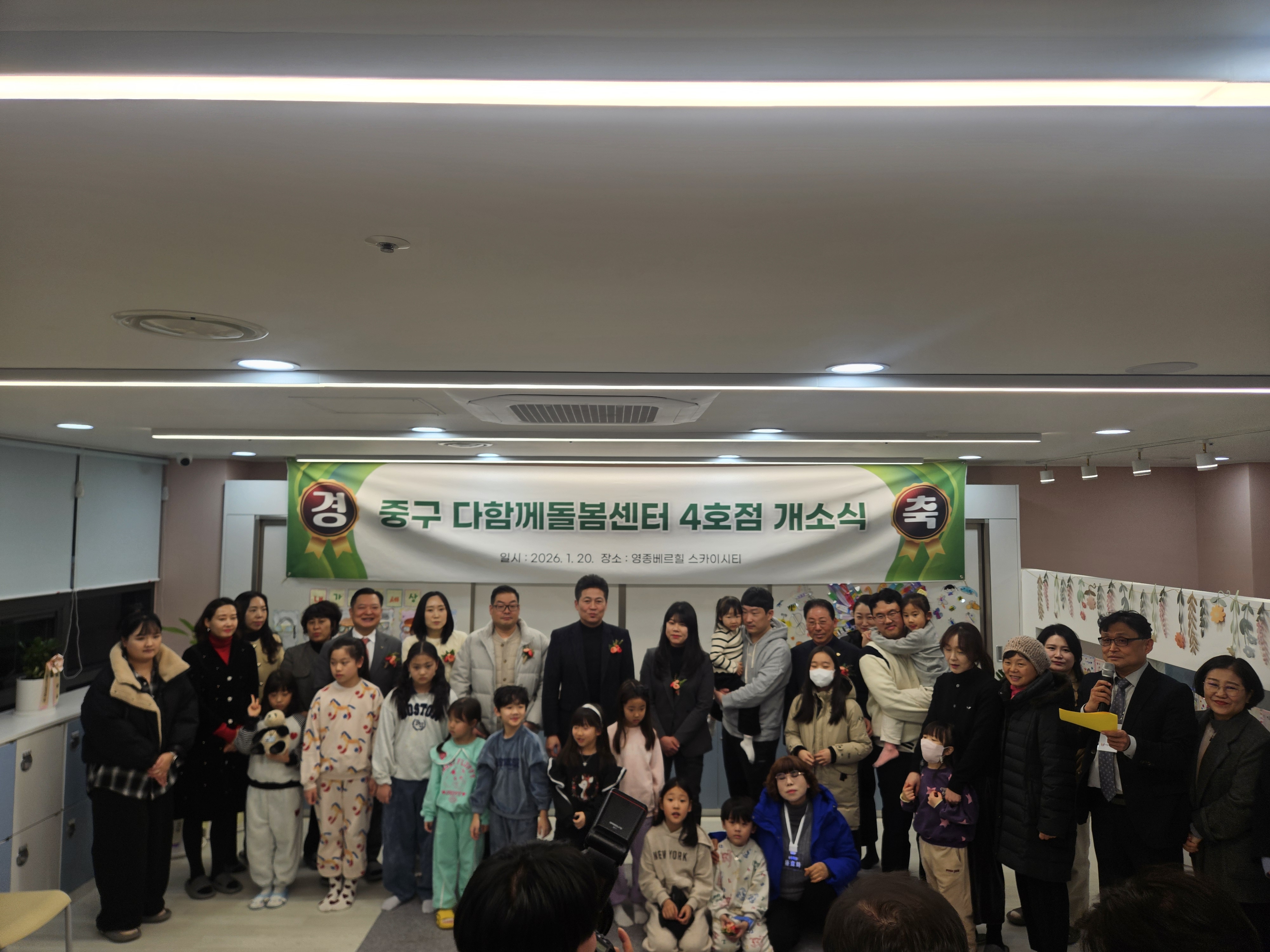 인천YMCA청소년재단에서 인천시 중구청으로 부터 수탁받은 중구 다함께돌봄센터 4호점이 2026년 1월 20일(화) 개소식을 진행하였다. 개소식에는 인천YMCA 조성일 회장과 김정헌 중구청장, 임현수 입주자대표회의회장 외에 구의원 및 입소 학부모들이 참석하여 성황리에 개최 되었다.