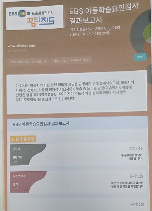 1월31일(토)오전10시부터12시까지 1~2학년은 학습요인검사, 3~4학년은 지능검사 실시