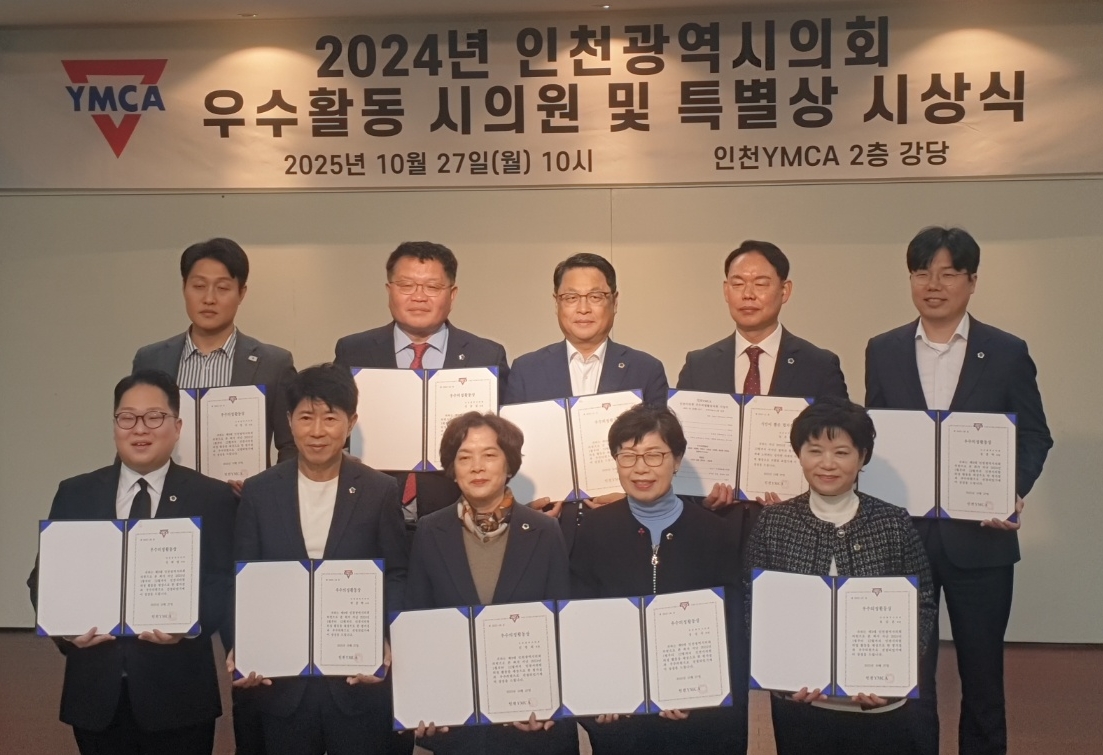 인천YMCA(이사장 김홍섭, 회장 조성일)는 제9대 인천광역시의회 2024년 활동에 대한 모니터링을 진행하고, 우수활동시의원 10명(김대영, 김대중, 김명주, 박종혁, 석정규, 신동섭, 신영희, 유승분, 장성숙, 정종혁 가나다순)에 대하여 시상 하고, 특별상으로 임춘원 시의원을 ‘시민이 뽑은 협치상’으로 시상하였다. 시상식은 10월 27일 오전 10시, 인천YMCA 대강당에서 진행하였고, 김홍섭 인천YMCA이사장과 조성일 회장이 시상하였다.