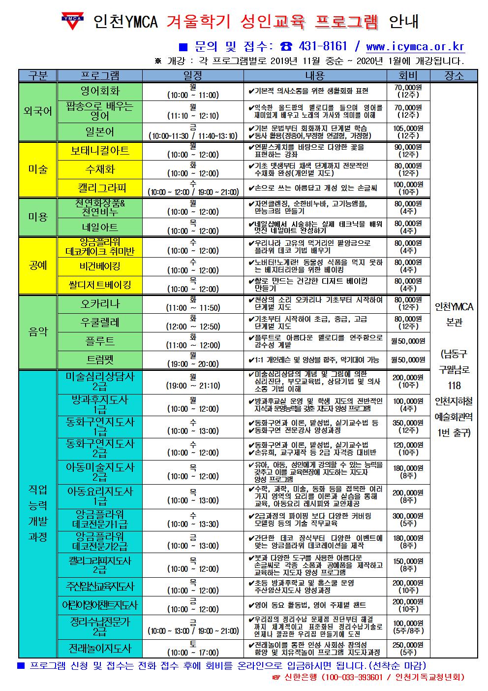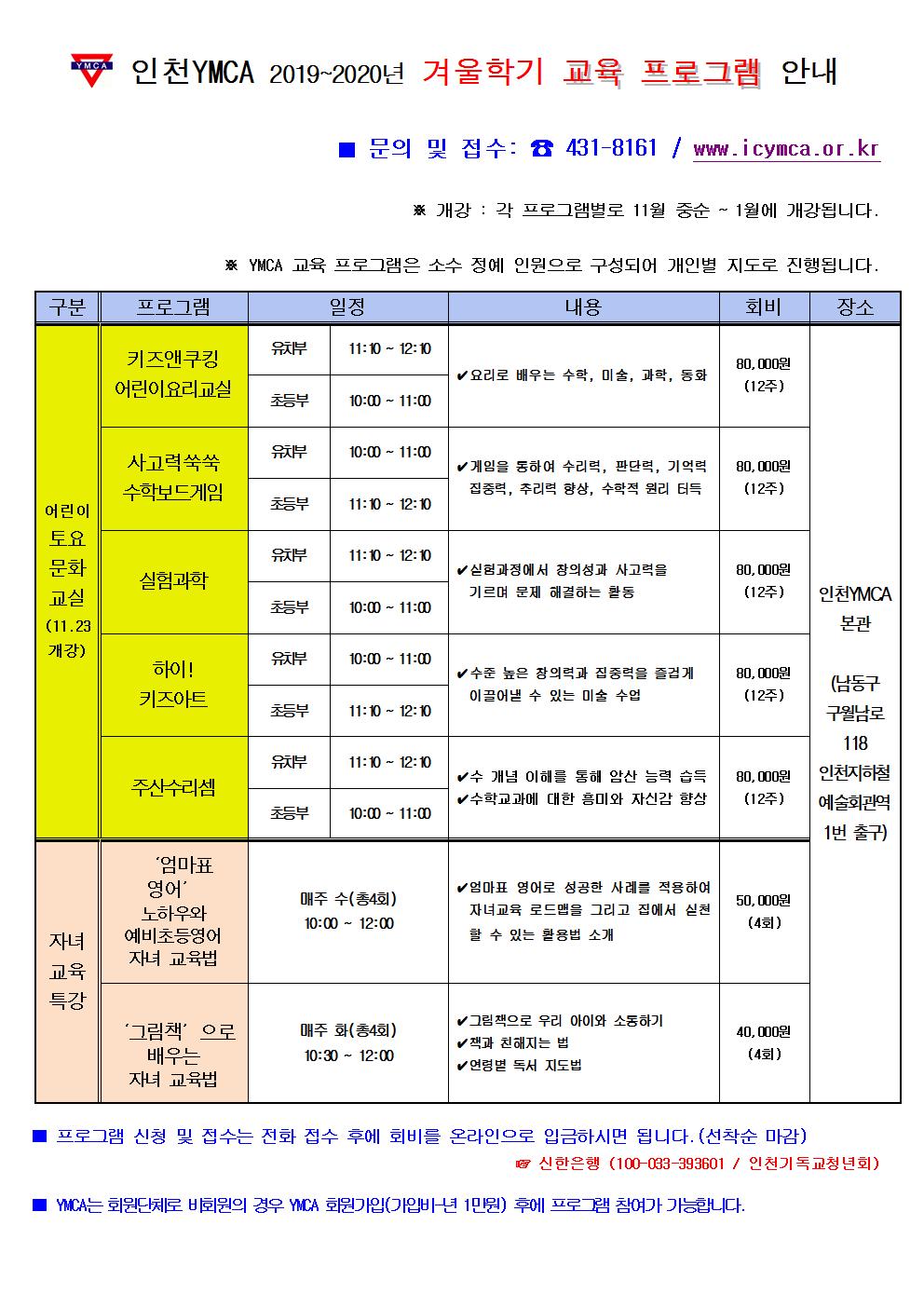 * YMCA는 회원단체로 Y비회원이신 경우에는 회원가입비(1년 10,000원)을 교육회비에 포함해서 납부해 주시면 됩니다.