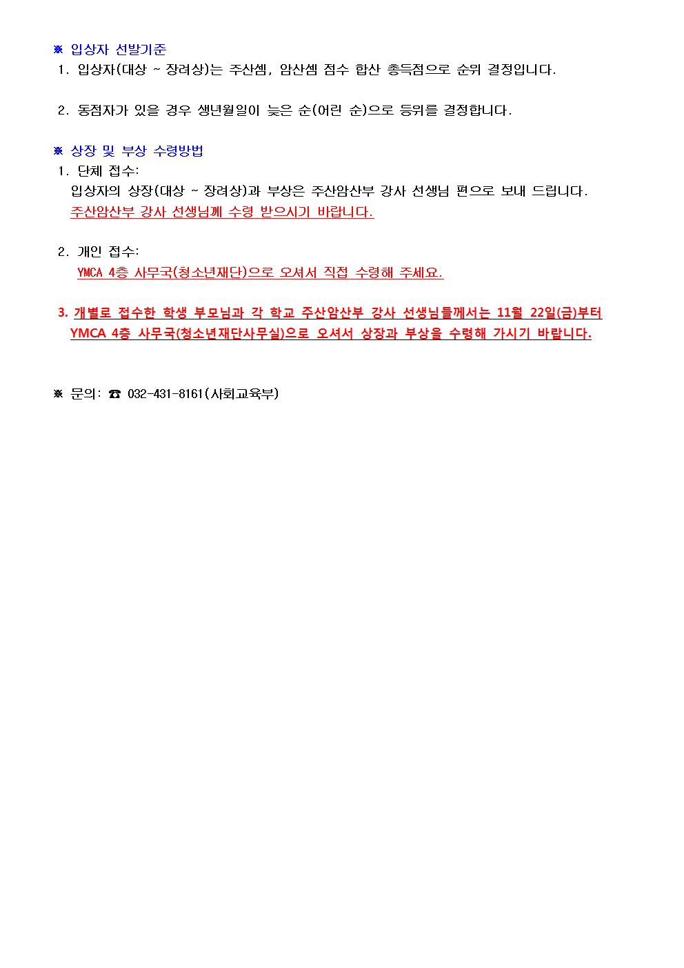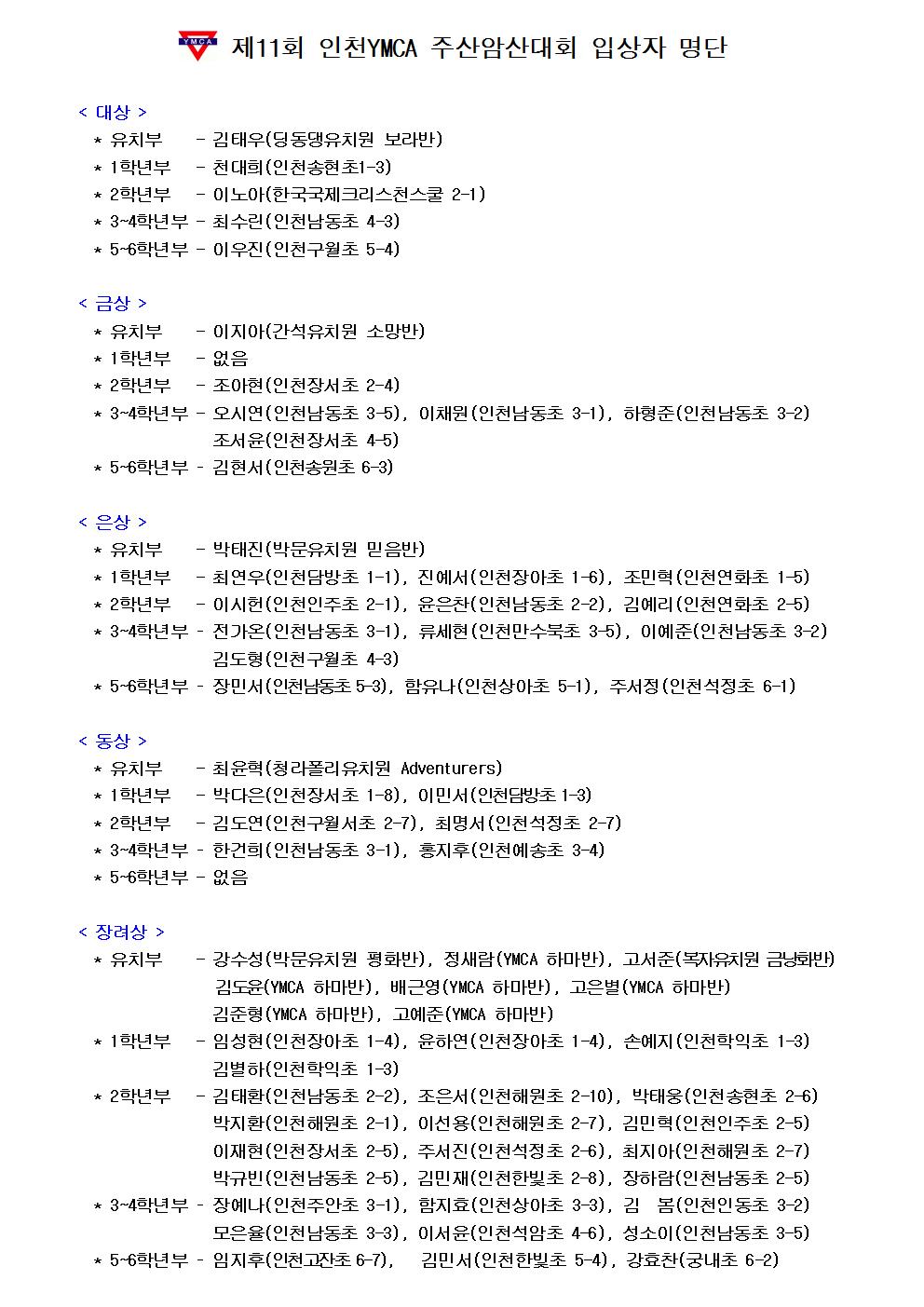 제11회 인천YMCA 주산암산대회 입상자 명단