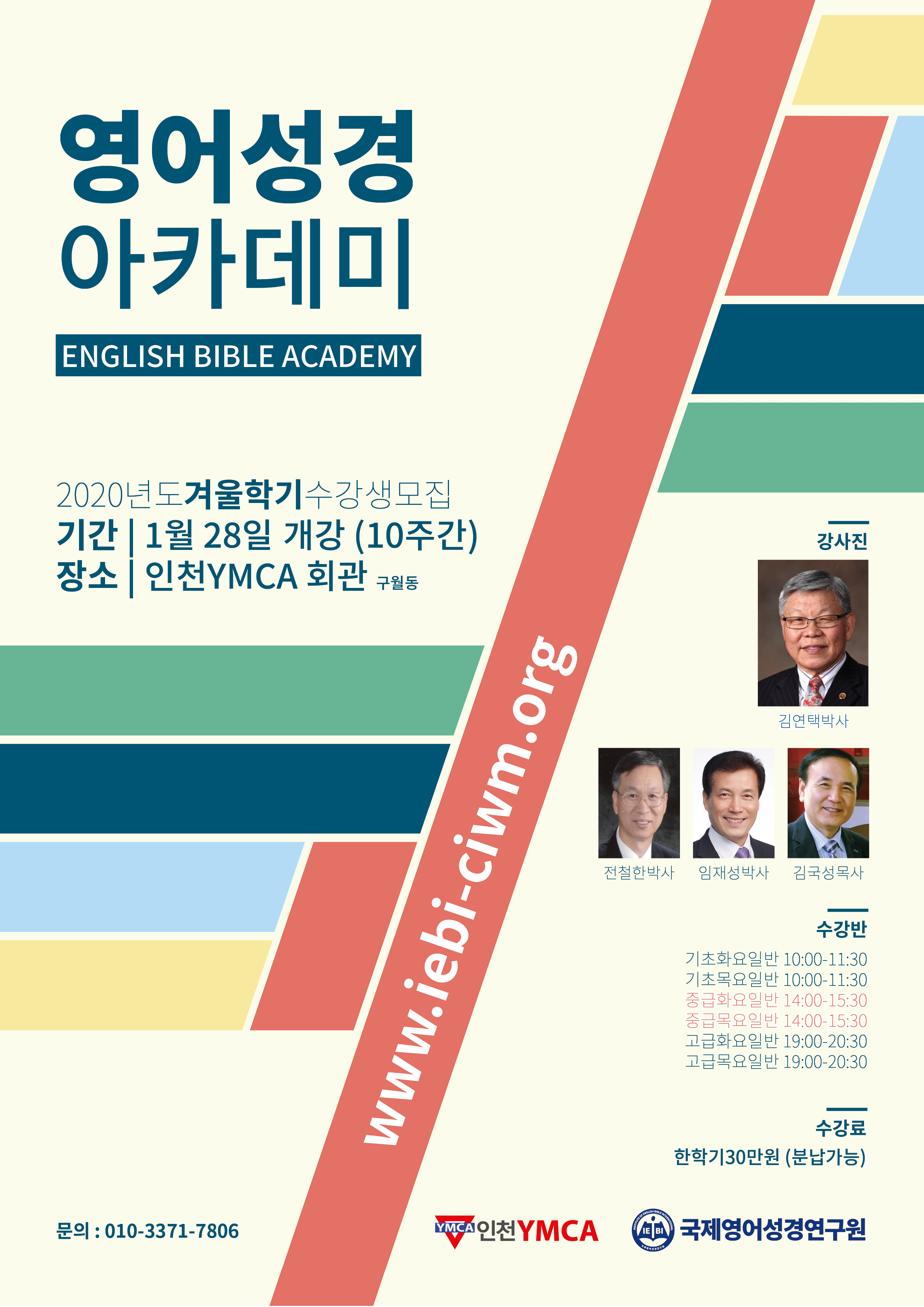 인천YMCA는 미국의 칼빈세계선교연구원 (CALVIN INSTITUTE OF WORLD MISSION) 에서 한국교회 목회자, 선교사, 평신도들의 세계선교와 국내 다문화사역을 후원 협조하기 위하여 국내최초로 설립된 <국제영어성경연구원>과 함께 공동주관으로 영어성경교육 프로그램을 실시합니다. 참가신청 교육대상과 과정 목회자, 선교사, 전도사, 영어예배사역자, 다문화사역자, 선교사지망생, 성경과 영어를 함께 배우기 원하는 청장년 남여 성도 누구나 환영합니다. 초급반, 중급반, 그리고 고급반으로 운영되며, 교재는 영어성경 (NIV), 김연택박사의 “내영혼아 깨어라” (Awake, My heart), “새로운 시작” (New Beginning) 을 주로 사용합니다. 교과 내용은 초, 중급반에서는 사도신경, 주기도문, 십계명을 영어로 배우고 암송하는 훈련, 성경의 책별 개요와 주제, 그리고 인물을 영어로 배우고, 생활영어회화, 고급반에서는 영어설교 통역 및 영어설교 훈련을 합니다