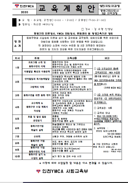 <동화구연지도사 2급> ■ 강 의 명 : 동화구연지도사 2급 ■ 교육대상 : 일반성인 ■ 일 시 : 매주 수요일(10주) 오전반 (10:00-12:00) / 오후반 (19:00-21:00) ■ 내 용 : 동화구연과 이론, 발성법, 실기교수법 등 2급 자격시험대비 정규반 ■ 회 비 : 120.000원(10주) / 교재비 별도 * 인천YMCA청소년재단 동화구연지도사 2급 + 손유희지도사 자격증 동시 취득 < 접수등록 안내 >