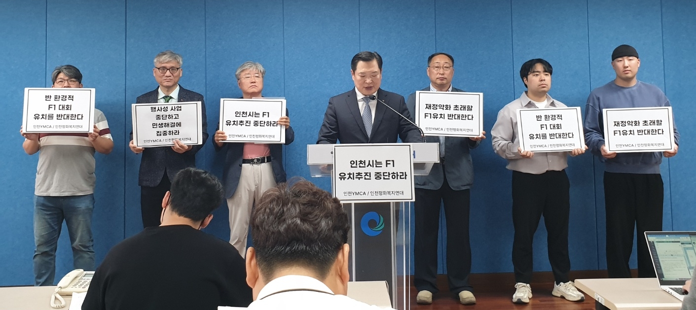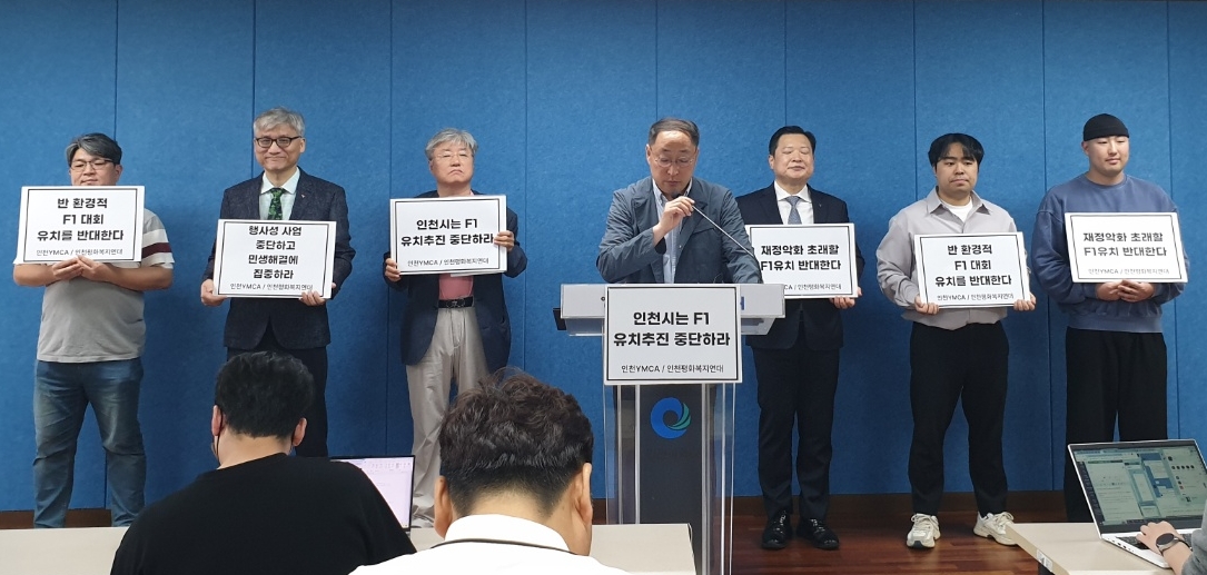 인천YMCA(회장 조성일)와 인천평화복지연대(상임대표 강주수)는 5월 13일(월) 오후2시, 인천시청 기자회견실에서 인천시의 F1 유치에 반대하는 기자회견을 진행했다. 이광호 인천평화복지연대 사무처장의 사회로 진행된 이번 기자회견에서는 강주수 인천평화복지연대 상임대표와 차성수 인천YMCA 사무처장이 취지 발언을 하였고, 조성일 인천YMCA 회장이 기자회견문을 낭독하였다. 인천YMCA와 인천평화복지연대는 F1 대회가 재정적으로 실패할 가능성이 높으며, 인천시 재정을 악화시킬 것이고, 반환경적인 대회이며, 인천시의 도시 이미지에도 도움이 되지 않는다는 이유로 반대 입장을 표명했으며 이후에도 중단하지 않을 경우 인천지역 시민사회와 함께 지속적으로 반대 운동을 전개할 것을 밝혔다. 기자회견문 전문은 아래와 같다.