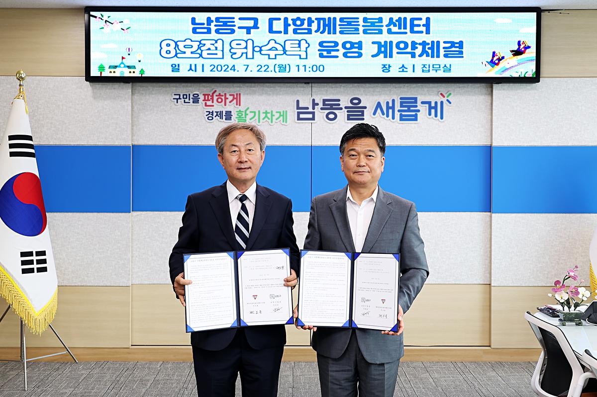 인천YMCA청소년재단에서는 7월 22일(월) 11시 남동구청 구청장실에서 남동구 다함께돌봄센터 8호점 위수탁 운영 계약을 체결하였다. 이날 계약 체결을 위해서 재단에서는 권오용 이사장과 이재춘 사무국장이 참석하였다. 권오용 이사장은 지역사회에서 아동 청소년들이 건전하게 성장할 수 있는 환경을 만들기 위해 노력을 다하겠다고 다짐을 밝혔다. 권오용 이사장은 남동구청에서 박종효 구청장과 위수탁 계약을 체결한 후에 현재 운영중인 남동구 다함께돌봄센터 7호점을 방문해서 돌봄센터의 운영을 살펴보고 센터 직원들을 격려했다.