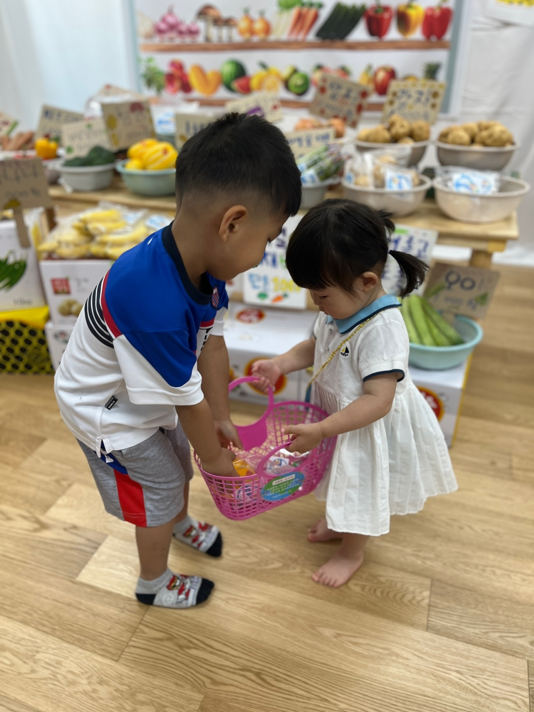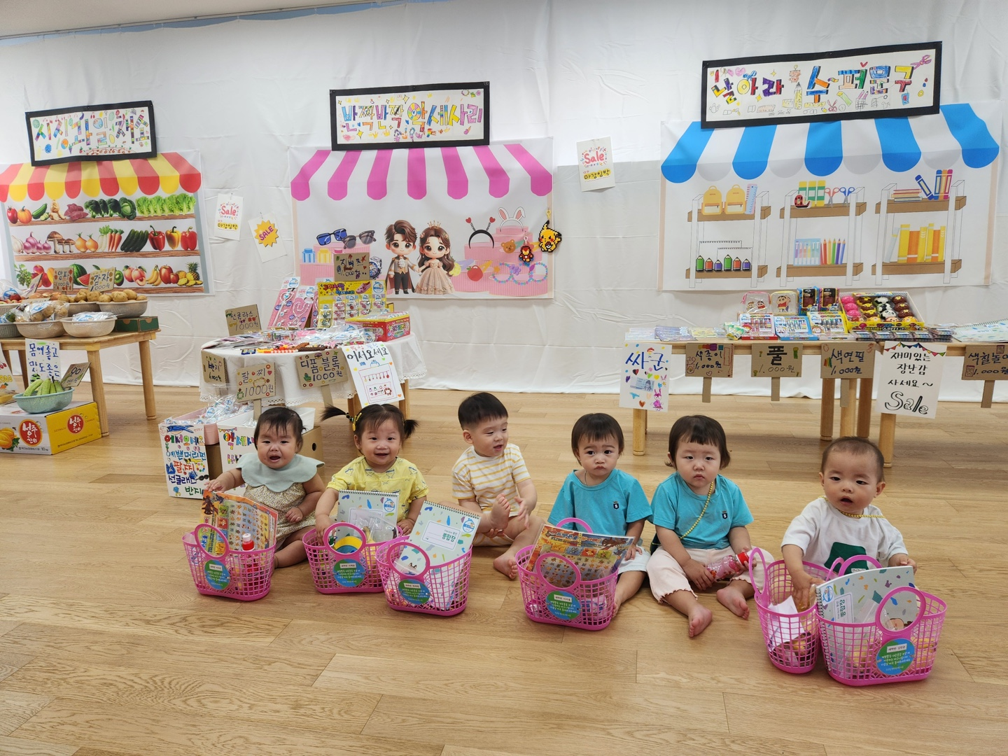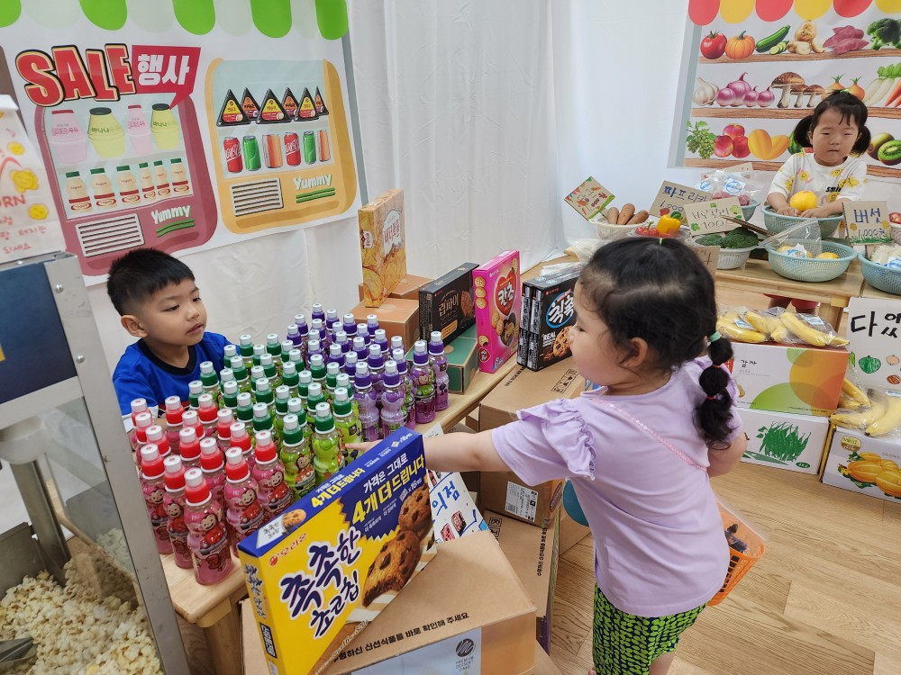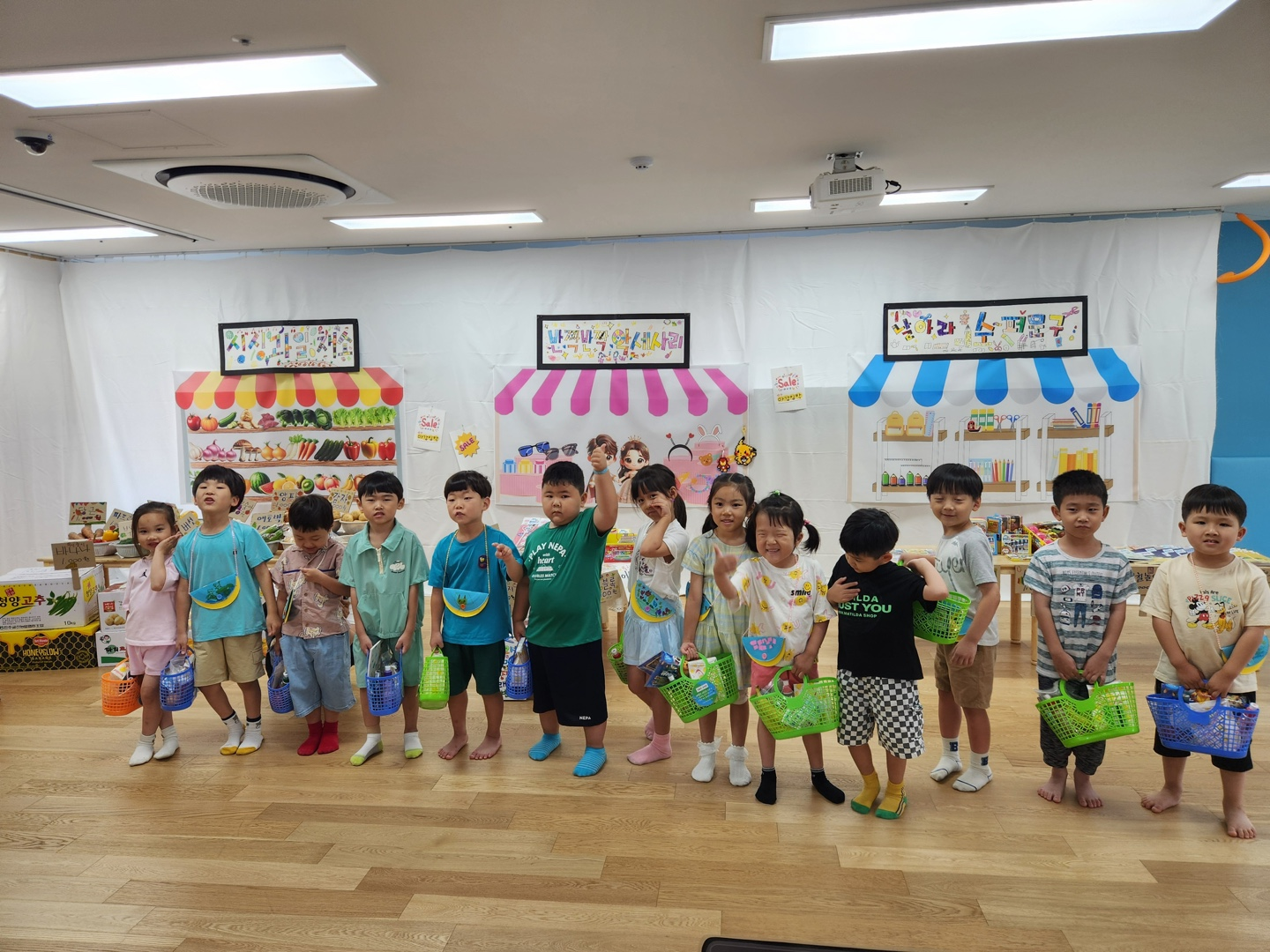 2024년 6월 27일 청천1동어린이집에서는 스페셜데이 ‘나혼자 (물건을)산다’ 시장놀이를 진행하였다. 마트와 문구점, 악세사리, 채소 가게등에 필요한 간판, 가격표 등을 6,7세가 협력하여 만들고 동생과 친구들에게 물건 판매를 하였다. 아이들은 시장바구니와 미리 만든 지갑에 카드와 돈을 넣어 내가 사고 싶은 물건을 장바구니에 담아보며 계산을 하는 경험을 가졌다. 형님들과 동생들이 한자리에서 어우러져 함께 만들어가는 소중한 시간이었다.