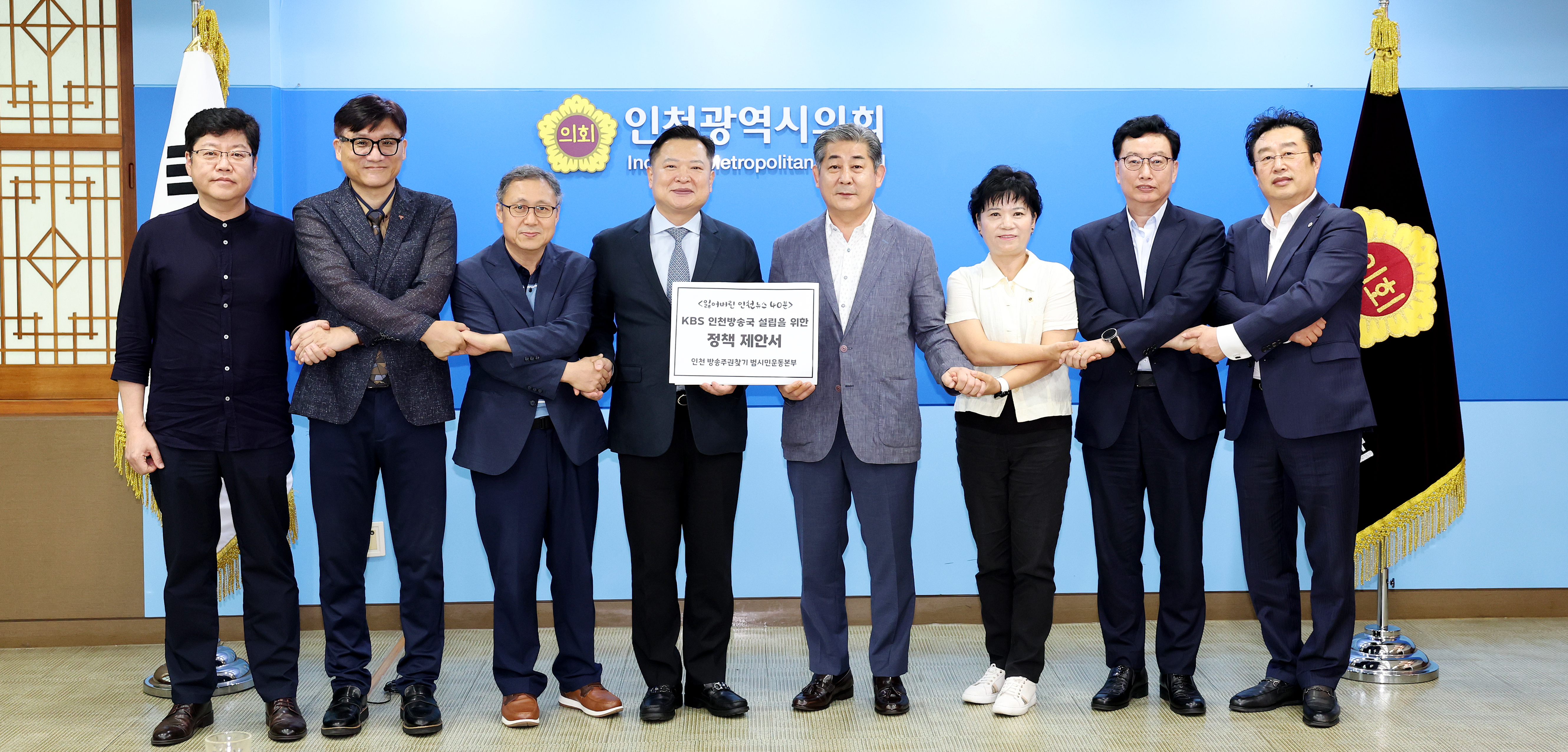 1. <인천 방송주권찾기 범시민운동본부>(이하 방송주권본부, 상임대표 조성일)는 지난 8월 26일(월) 11시에 정해권 인천광역시의회 의장과 간담회를 하고, <제9대 인천광역시의회에 전달하는 KBS 인천방송국 설립을 위한 정책 제안서>를 전달했습니다.