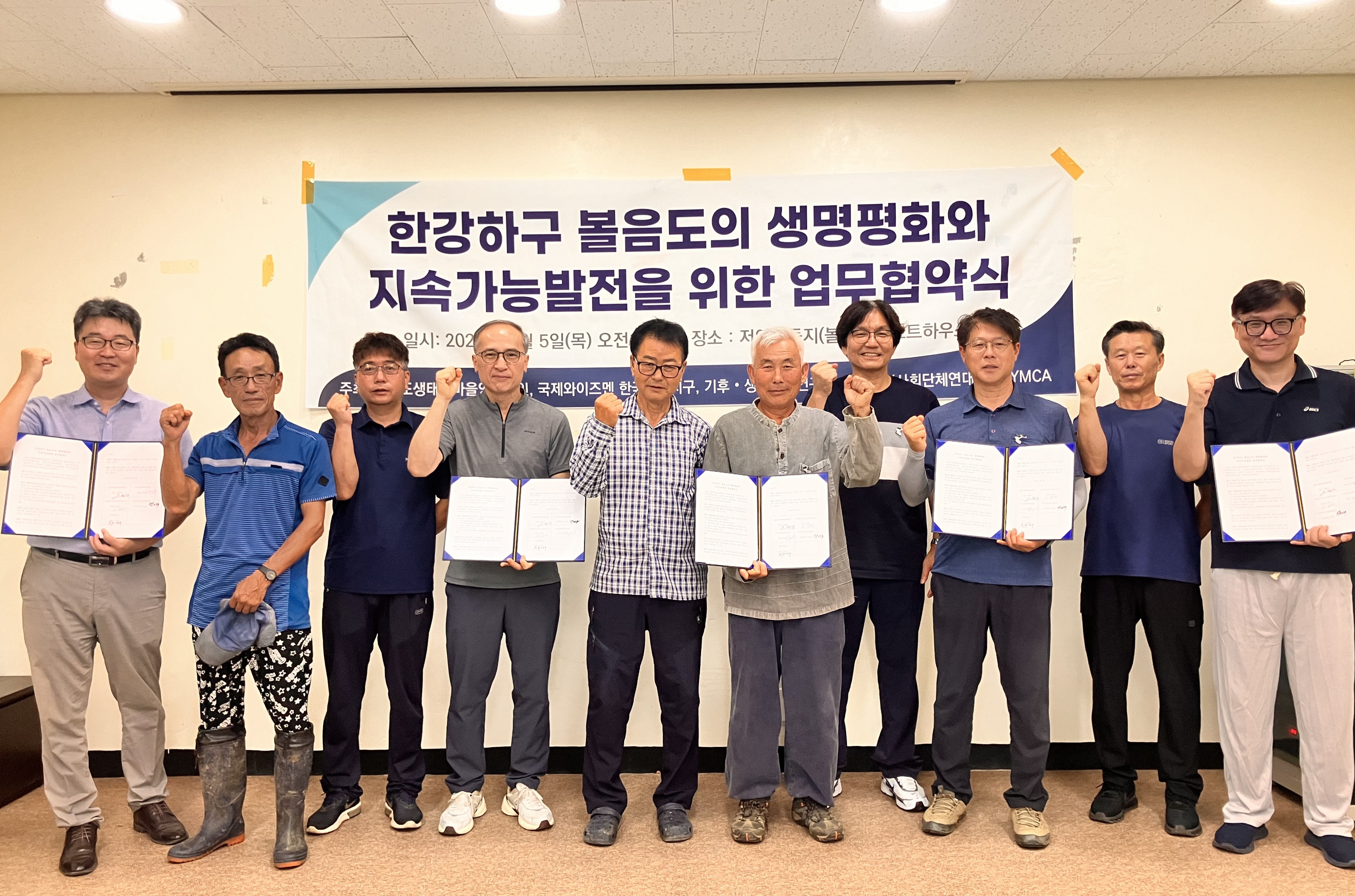 지난 9월 5일 볼음도 저어새둥지에서 볼음도생태계마을영농법인, 인천YMCA, 국제와이즈멘 한국인천지구, 인천시민사회단체연대, 기후생명정책연구원이 함께 한강하구 볼음도의 생명평화과 지속가능발전을 위한 업무협약식을 진행하였다. 볼음도의 평화의 의미와 지속가능발전의 의미를 담은 이번 협약식에는 볼음도 저어새둥지(게스트하우스) 활성화, 천연기념물 갯벌 보전, 볼음도와 인천시민 네트워크 구축, 한강하구 평화 운동 등에 대해 함께 힘을 합치는 것에 대해 합의하였다. 이번 협약식에는 오형단 볼음도생태계마을영농법인 대표, 이강인 국제와이즈멘 한국인천지구총재, 차성수 인천YMCA 사무처장, 박인규 인천시민사회단체연대 공동대표 등이 참석하였다.