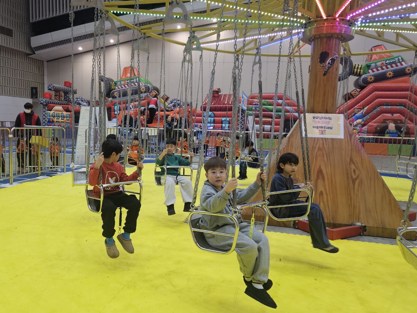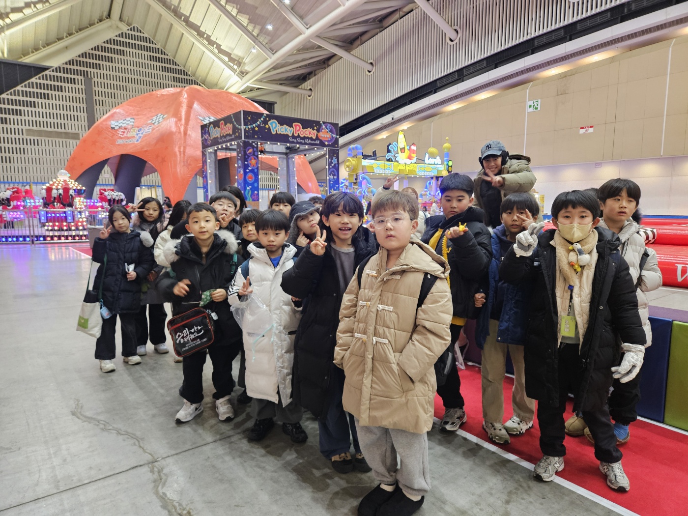 며칠 전부터 손꼽아 기다리던 아이들은 강한 한파로 걱정했던 것이 무색하게 일찍부터 돌봄센터에 등원하여 출발시간을 기다렸습니다. 찬바람을 맞으면서도 씩씩하게 걸어서 버스정류장까지 이동하고, 대중교통에서 규칙도 잘 지키며 현장학습 장소까지 도착한 아이들에게서 기대감에 가득찬 표정을 발견 ㅎㅎ 현장학습 장소는 송도 컨벤시아에 설치된 '상상체험 키즈월드'로 아이들이 좋아하는 실내놀이터랍니다 초대형 썰매와 로켓 팡팡 아슬아슬 회전짚라인과 회전 그네 수중 다람쥐와 낚시 체험 그리고 놀이터에서 빠질 수 없는 대형 에어바운스까지 하루종일 각종 놀이기구들이 아이들을 쉴 틈없이 즐겁게 만들어 주었답니다.