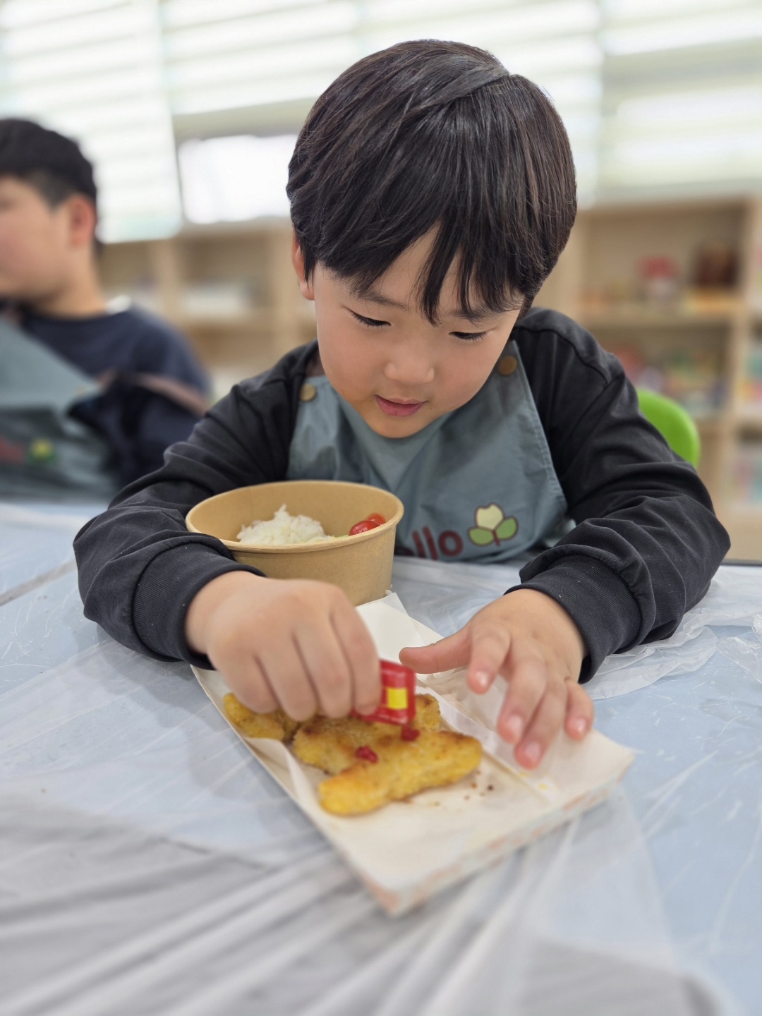 미추홀구다함께돌봄센터6호점에서는 3월 24일(화) ‘돈가스 컵밥’ 요리 활동을 진행하였다. 1. 방울토마토, 메추리알, 오이를 자르고 2. 저울에 올려놓은 컵에 밥 160그램과 양배추 30그램을 계량하는 과정에서 요리 체험은 수학적 개념을 자연스럽게 습득할 수 있는 활동임을 느낄 수 있었다. 3. 안전장갑을 착용하고 아이들이 좋아하는 포켓몬 시리즈 피카츄 모양의 돈가스를 조심스럽게 튀긴 후 케찹으로 눈,코,입 꾸미기 작업으로 마무리하였다. 4. 디저트로 블랙포도, 샤인머스캣, 딸기를 투명컵에 담으면서 아이들은 연신 행복한 표정으로 만족감을 표현했다.