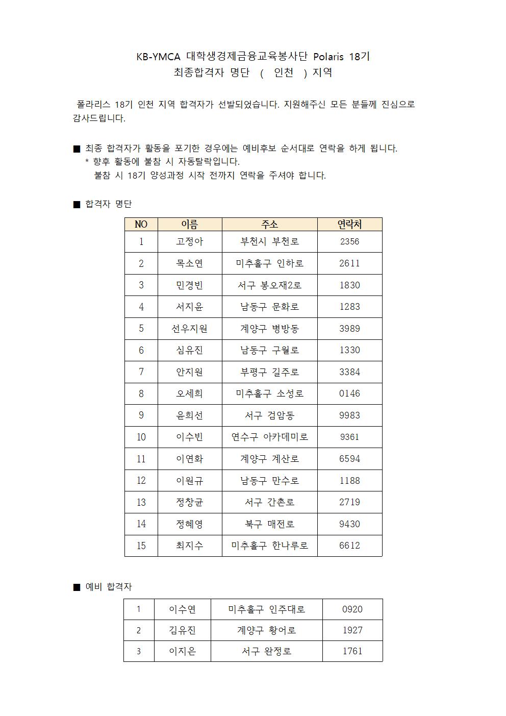 > 준비물 : 편안한 복장, 개인용 컵 (1회용 컵 제공하지 않습니다), 필기도구 - 재학증명서 - 학자금대출, 저소득층 등의 증명서류 - 저소득층 증명서류일 경우 가족관계증명서류 함께 제출 - 본인 명의 국민은행 통장 계좌번호 제출 2. 폴라리스 18기 개인시연 - 3월 31일(목)~4월 8일(금) (자세한 일정 양성과정 후 결정) 3. 인천 폴라리스 18기 발대식(추후안내) 4. 폴라리스 18기 교육활동 (22년 4월 ~ 8월) ※ 상기 일정은 사정에 따라 일부 변경될 수 있습니다. ※ 18기 강사 양성과정과 폴라리스 인천 발대식 불참자는 18기 선발 취소됩니다. ■ 강사 양성과정 내용 (1) 오리엔테이션 ① Polaris의 대한 설명 및 향후 일정 소개 ② YMCA 활동의 이해
