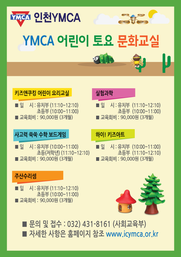 《 키즈앤쿠킹 어린이 요리교실 》 ■ 프로그램 : 키즈앤쿠킹 어린이 요리교실 ■ 교육대상 : 아동 ■ 교육일시 : 유치부 - 매주 토요일 11:00-12:10 초등부 - 매주 토요일 10:00-11:00 ■ 교육내용 : 요리로 배우는 수학, 미술, 과학, 동화 ■ 교육회비 : 90,000원 (12주) / 재료(교재)비 별도 ![]() 〈 접수등록 안내 〉 1. 프로그램 신청 및 접수는 전화 접수 후 회비를 온라인 입금하시면 됩니다. (선착순 마감) 2. YMCA는 회원단체로 YMCA 회원에 한해서 프로그램 참여가 가능합니다. * YMCA 비회원이신 경우에는 회원가입 후에 참여하시면 됩니다. 회원가입비(1년 10,000원)는 교육회비에 포함해서 납부해 주시면 됩니다. 3. 온라인 입금계좌 : 신한은행(100-033-393601 / 인천기독교청년회) 4. 문의 및 접수 : 032-431-8161 (사회교육부) 남동구 구월남로 118 인천YMCA (인천지하철 예술회관역 1번 출구) |