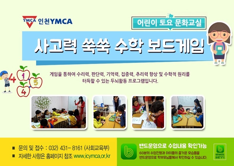 《 사고력쑥쑥 수학 보드게임 》 ■ 프로그램 : 사고력쑥쑥 수학 보드게임 ■ 교육대상 : 아동 ■ 교육일시 : 유치부 - 매주 토요일 10:00-11:00 초등부 - 매주 토요일 11:10-12:10 ■ 교육내용 : 게임을 통하여 수리력, 판단력, 기억력, 집중력, 추리력 향상, 수학적 원리 터득 ■ 교육회비 : 90,000원 (12주) / 재료(교재)비 별도