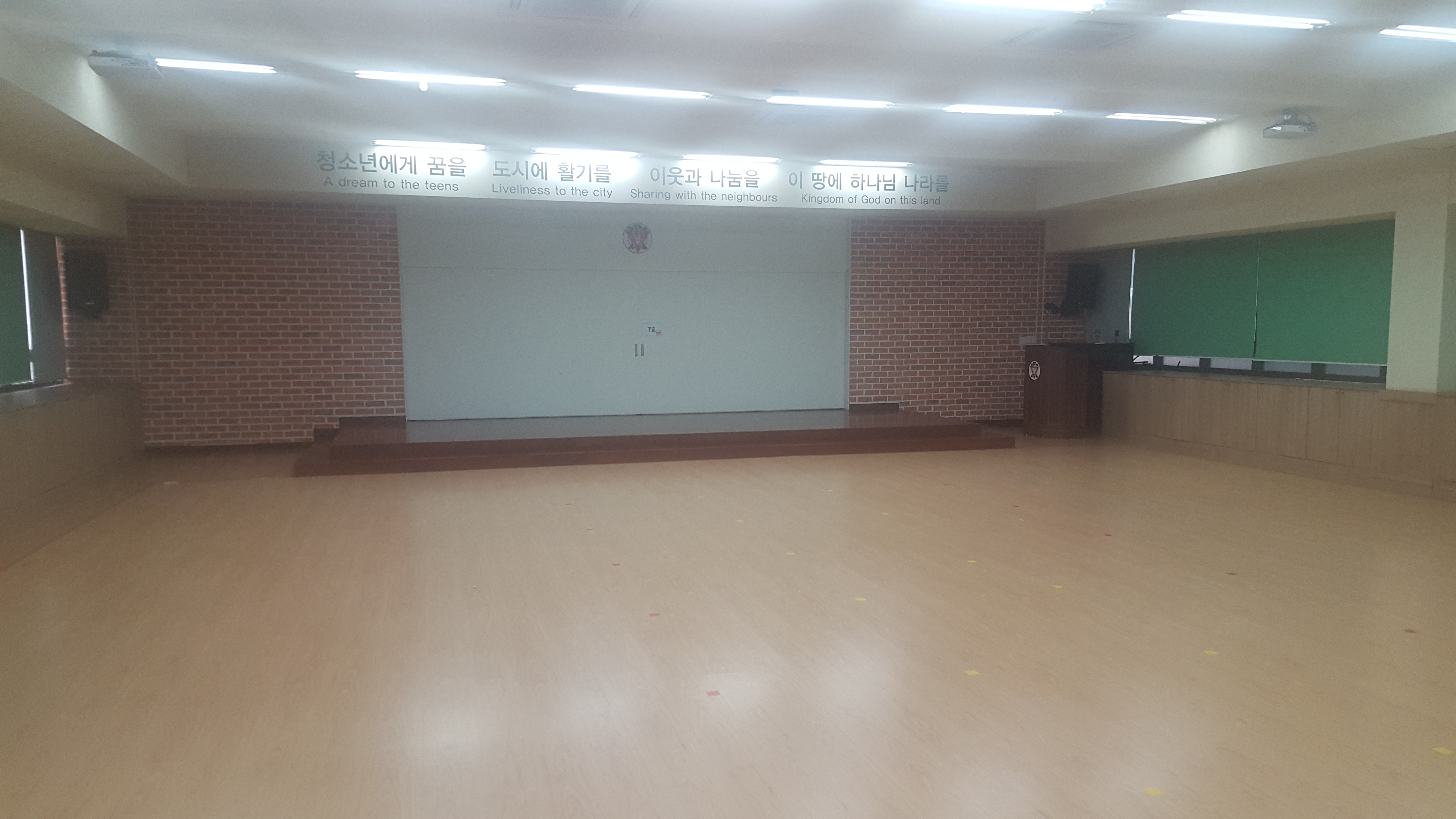 기자재 : 빔프로젝트 및 스크린 각 2대, 강단, 마이크 (최대 3대) 및 앰프, 의자 120개